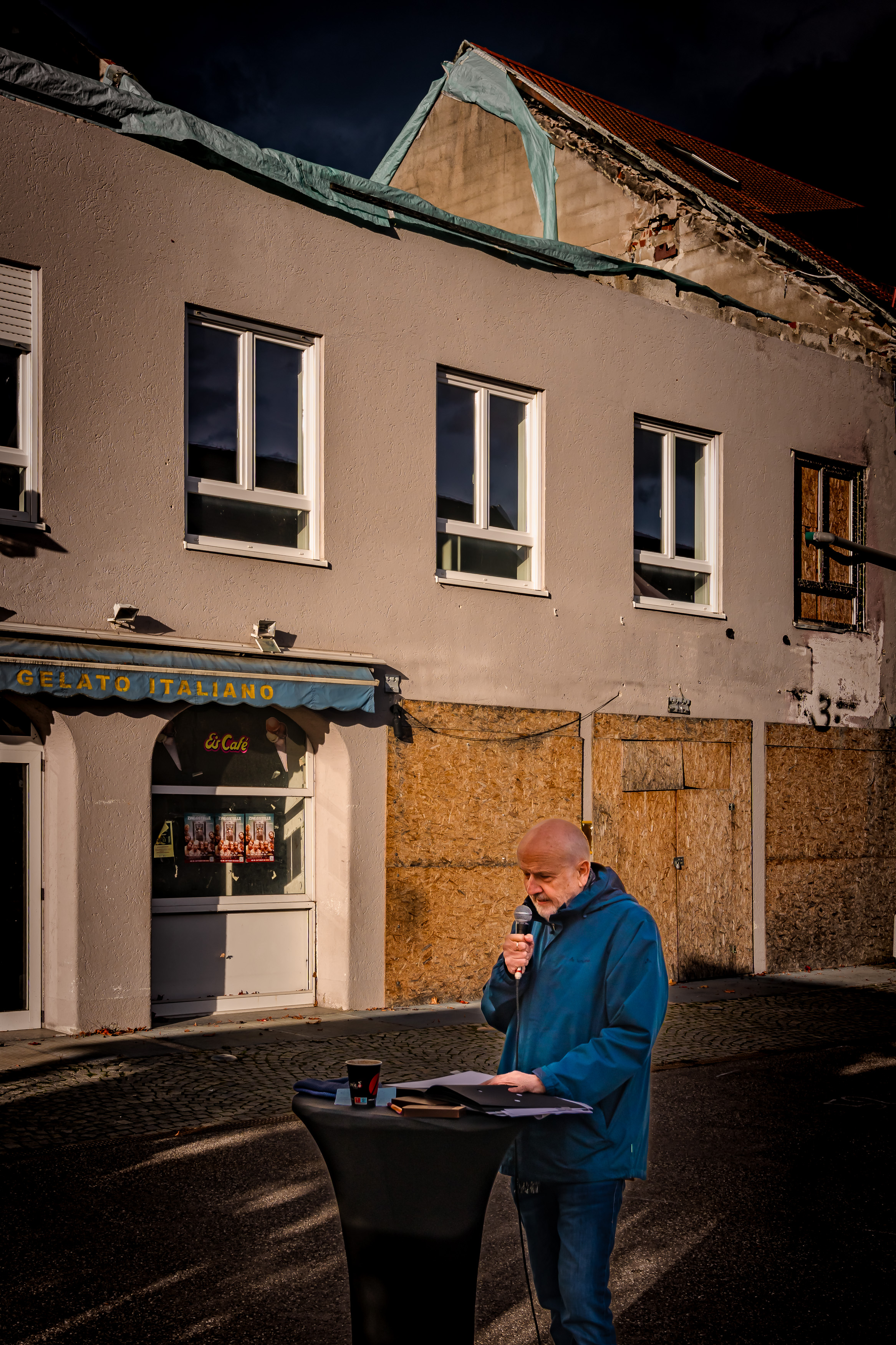 - POL/LYR: Auch durch die zweite Veranstaltung "Feuer, Fürsten, Finsternis" meiner neuen Polit-Poesie-Reihe konnte ich zusammen mit meiner Publikums-Schar ein kräftiges Zeichen setzen: Vor der Dauerbrandruine auf dem Markt Schwabener Marktplatz erschallten Gedichte und Balladen zu Fluch und Segen des Feuers (z.B. James Krüss "Das Feuer": Hörst du, wie die Flammen füstern, knicken, krachen, knacken, knistern... oder Theodor Fontanes "John Maynard": Feuer war es, was da klang), zur Macht und Willkür von Fürsten (z.B. "Die schlesischen Weber" von Heinrich Heine) und zur Finsternis und wie man sie überwinden kann(z.B. "Die Sternseherin Lise" von Matthias Claudius). Mit einem Vortrag aus meinem Essay "Revolution! Lyrik als Stachel der Politik" habe ich die Zuhörer ins Nachdenken gebracht, wie man der "politischen Weltverödung" eine "aufrührerische Weltfreundschaft" entgegenstellen kann. Nachzulesen hier.
